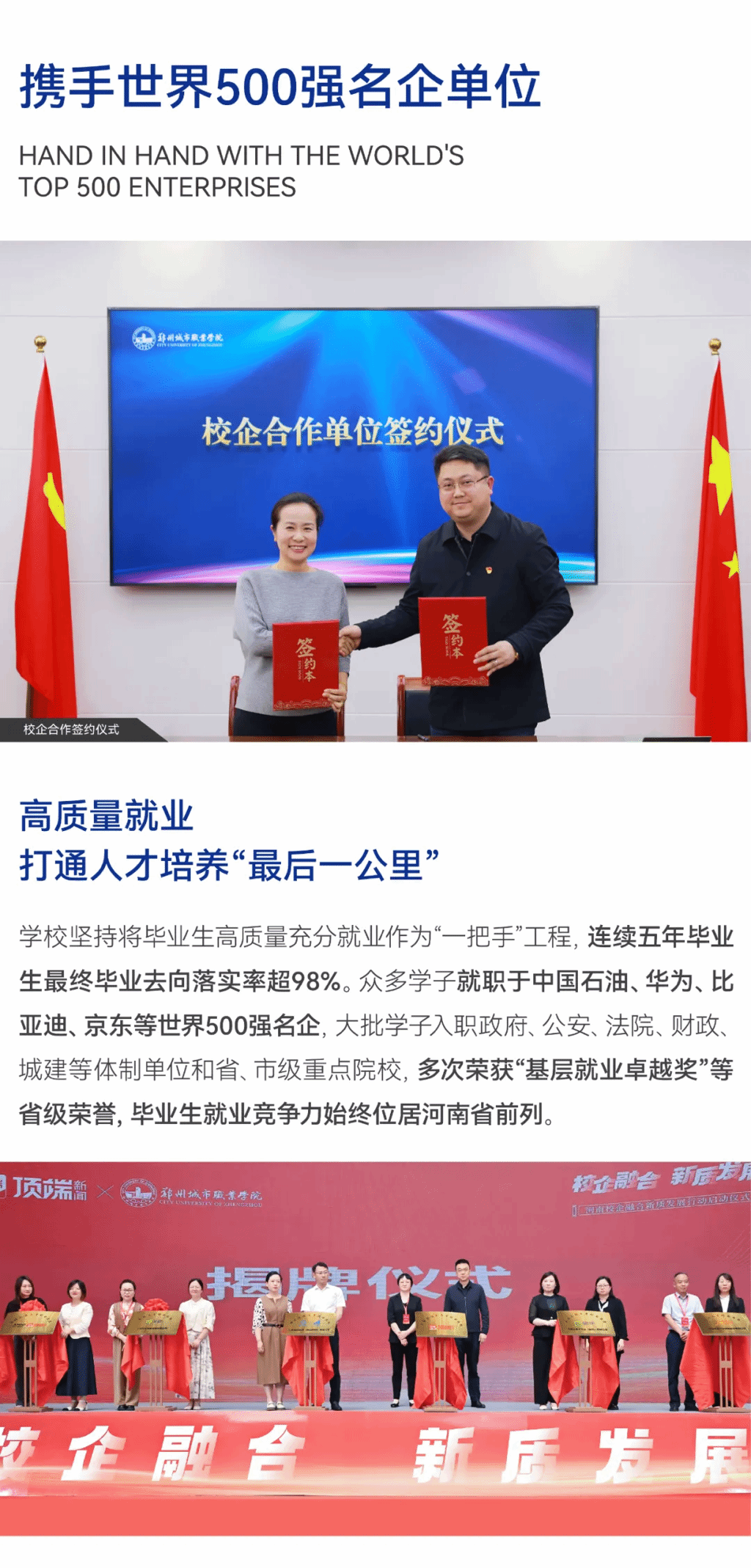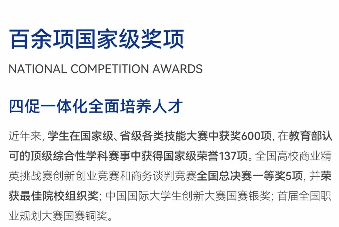 学校毕业生就业去向落实率连续五年保持在98%以上,聚焦中国建筑、中国石油、华为、京东等世界500强企业,提供100余家稳定的实习就业企业,毕业即高起点高质量就业。