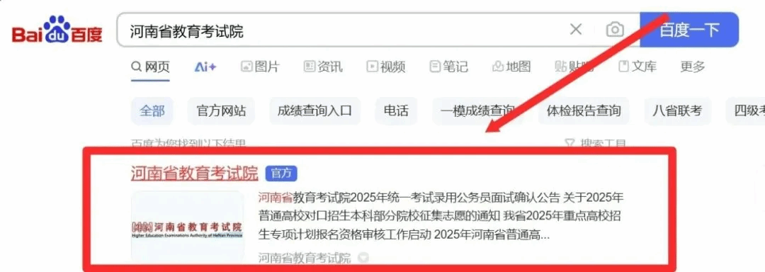 考生登录河南省教育考试院官网(https://www.haeea.cn/),或在搜索引擎中输入“河南省教育考试院”,点击带有“官方”标识的网站。