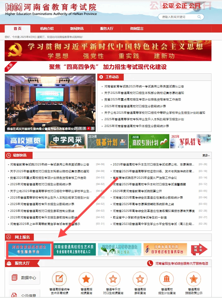 点击跳转进入河南省教育考试院官网,点击如下图示位置,进入“河南省普通高校招生考生服务平台”(https://pzwb.haeea.cn)系统。