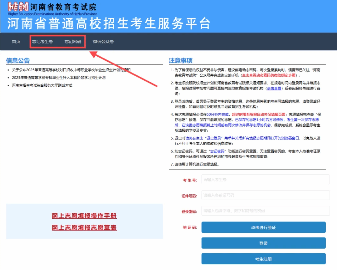 进入考生服务平台后,请仔细阅读“信息公告”区、“注意事项”区发布的政策公告和注意事项。
